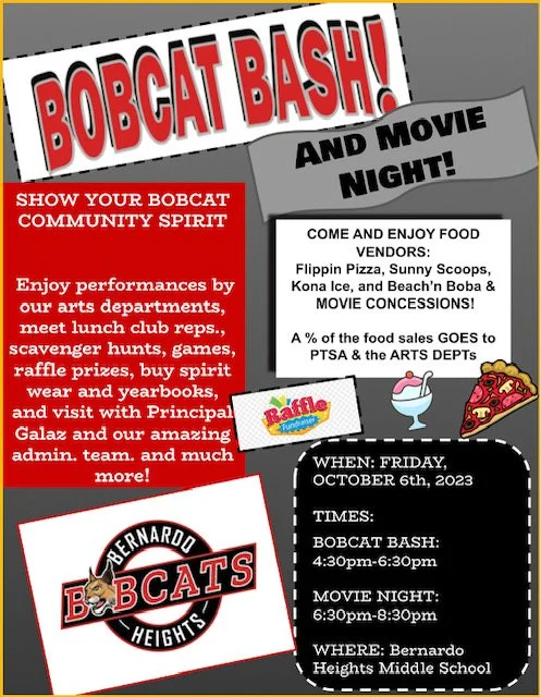 /This just in…Flippin’ Pizza will be selling pizza, garlic knots, and drinks and the amazing Susie at Sunny Scoops will be selling ice cream at the Bobcat Bash, along with Kona Ice, and Beachin’ Boba. Volunteers & Donations for Raffle Prize Fundraiser are NEEDED! See link to help make this school community event shine! https://www.signupgenius.com/go/10C0A44ADAA2FA4FE3-bobcat